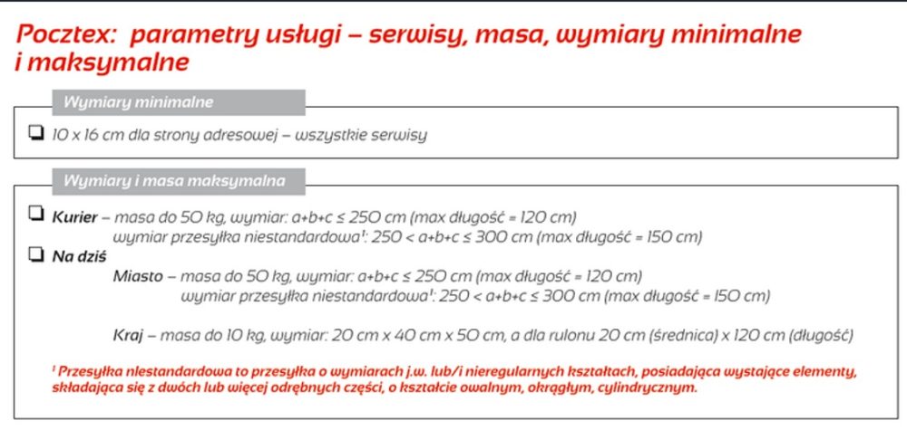 - przesyłka będzie posiadała parametry standardowe i nie będzie przekraczała formatu XL i masy 20 kg.